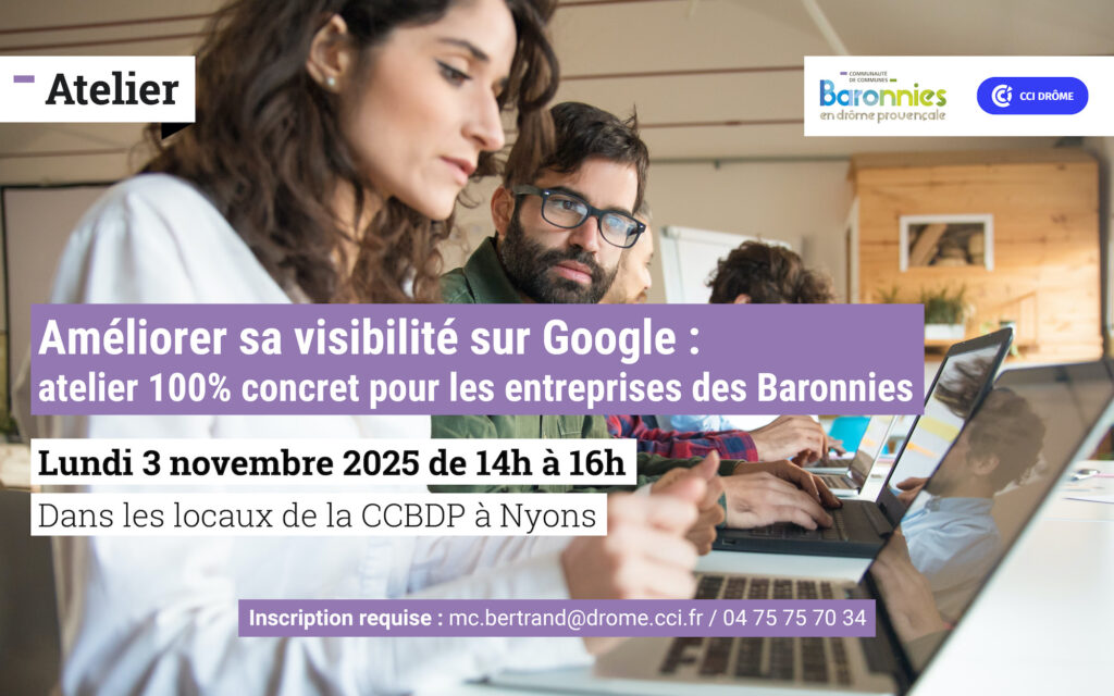 Cet atelier s’adresse à tous les professionnels souhaitant renforcer leur attractivité en ligne et toucher davantage de clients. Il est ouvert à toutes les entreprises du territoire sur inscription : Marie-Claire BERTRAND : mc.bertrand@drome.cci.fr ou 04 75 75 70 34