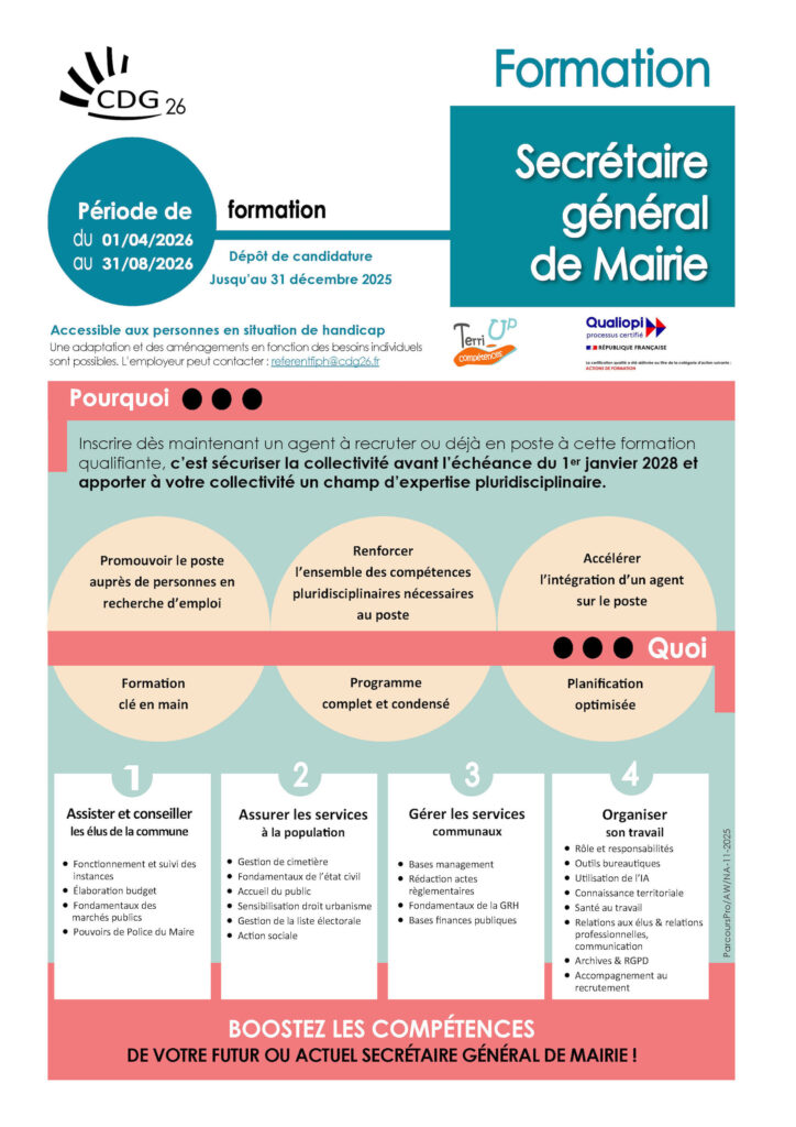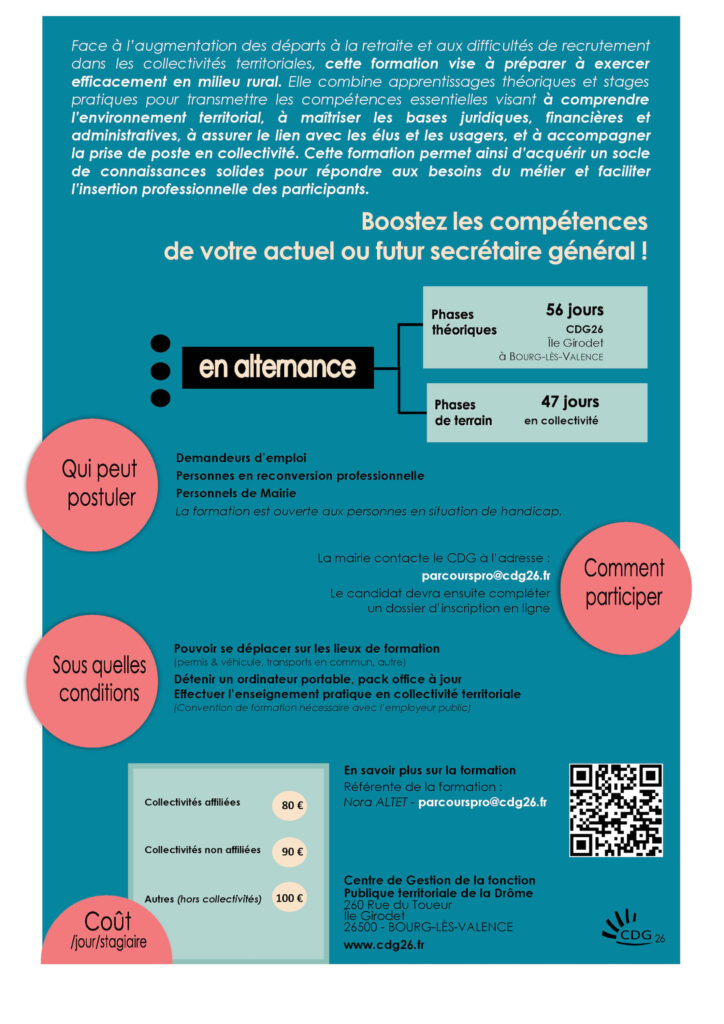La référente formation Nora ALTET se tient à votre disposition pour tout complément d’information : parcourspro@cdg26.fr | 06 01 22 80 36